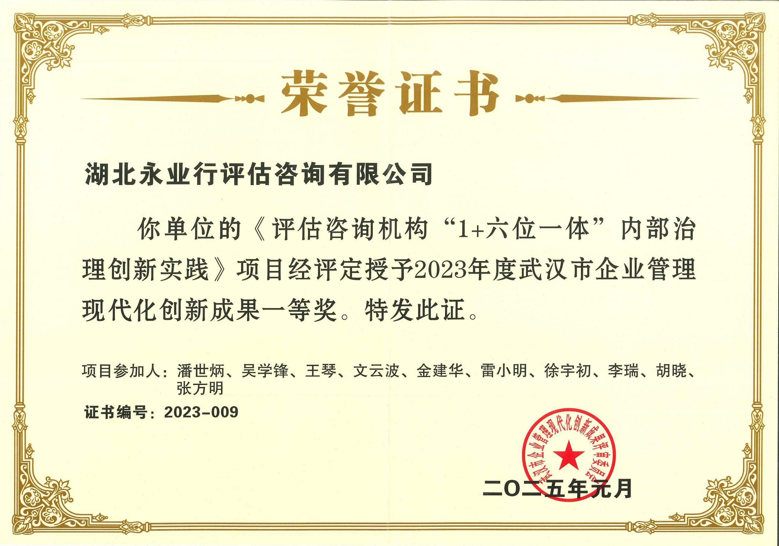 永业行荣获2023年武汉市企业管理现代化创新成果一等奖