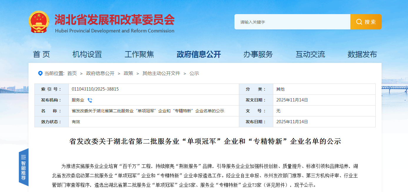 为推进实施服务业企业培育“百千万”工程,持续擦亮“荆新服务”品牌,2024年湖北省发改委首次启动服务业“单项冠军”企业和“专精特新”企业申报遴选工作,本次为第二批评选。